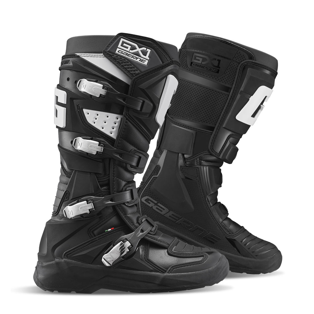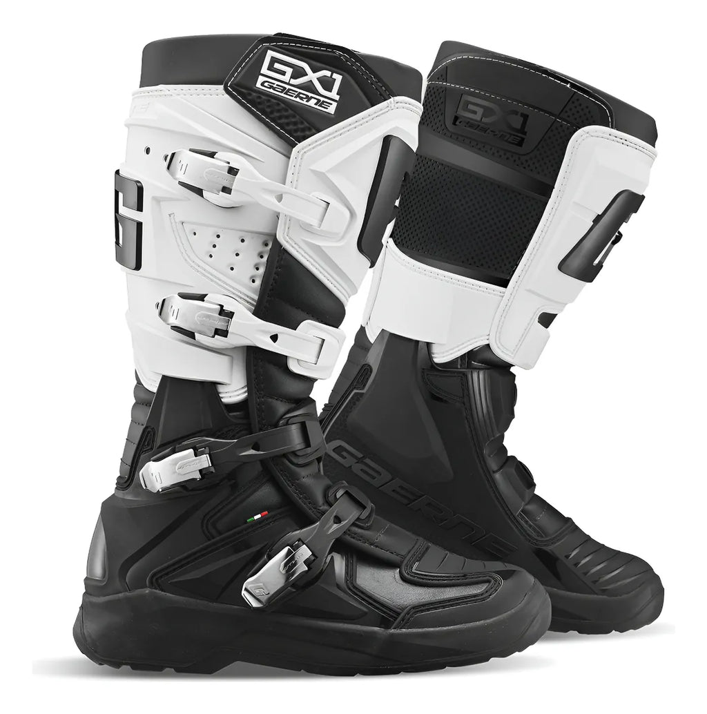 As botas Gaerne GX-1 EVO são realmente as mais curtas (por um centímetro) e leves entre modelos da marca, esse foi claramente o objetivo da marca ao projetar e comercializar este modelo específico. Com a parte superior da tira-strap na sua regulagem máxima ela tem uma abertura na perna de 43 cm. Isto pode ser aumentado se a parte superior da tira-strap não for utilizada. A parte interna apresenta extremo conforto por ser toda revestida em mid-calf (malha de bezerro), forro muito respirável e leve fazendo com que tenha uma grande facilidade em vestir e tirar com rapidez. A parte superior é feita de couro sintético e materiais plásticos mais duros que formam as secções rígidas para a resistência lateral e proteção geral. Painéis flexíveis acolchoados na área do peito do pé e acima do calcanhar fornecem ótima flexibilidade. A área inferior do pé é coberta por uma camada de plástico injetado leve que se estende até a seção de placa dianteira no lado interno. Camadas sintéticas fornecem força adicional e proteção do lado exterior. Com as fixações por quatro pontos para as peças de plástico, dando assim maior resistência a bota.